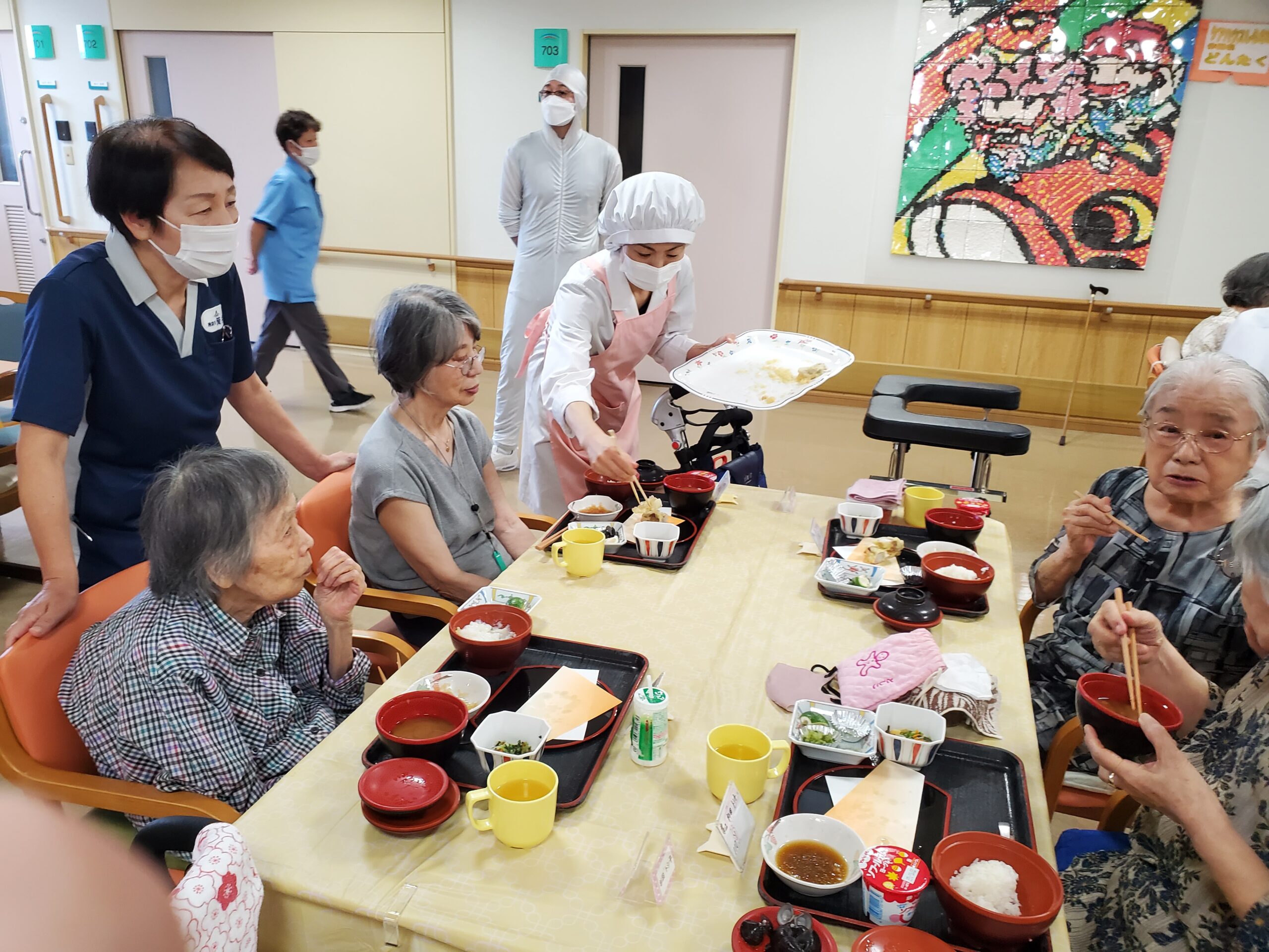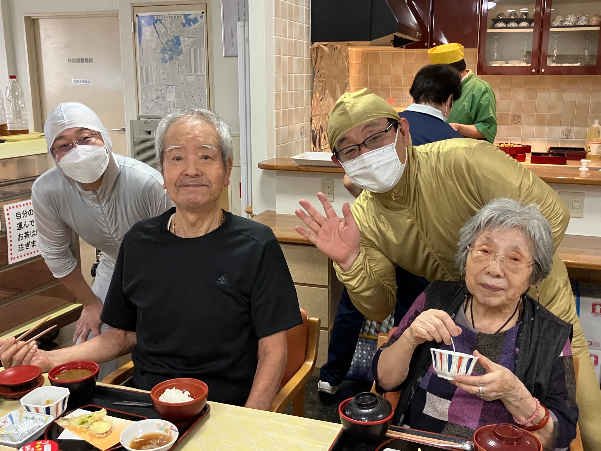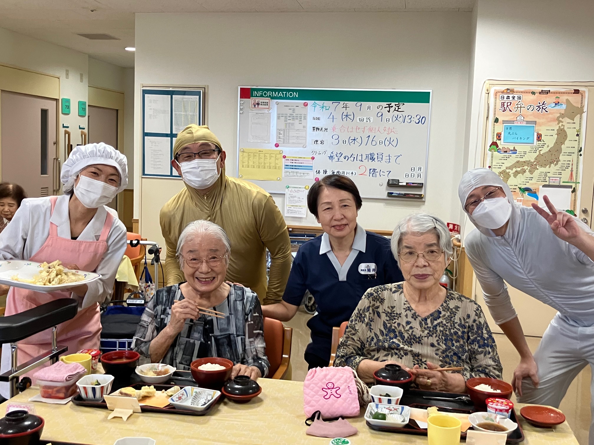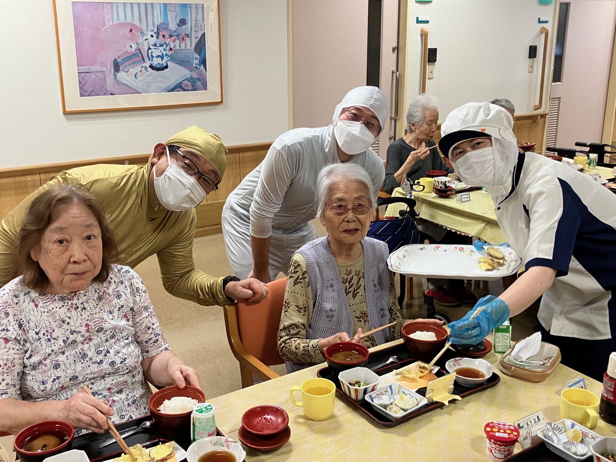 ケアハウスでは、9月18日に敬老会を催しました。 最高齢の95歳になられる利用者様を初め、 皆様に施設長よりお祝いの言葉を頂き 天ぷらバイキングでは『やっぱりあげたてがいいね』との 声が聞かれるなか、天ぷらを堪能して頂き、 職員の『金&銀』による 早押し!顔面!パイゲームで大爆笑⁉ おいしいの声と笑顔の敬老会でした。
