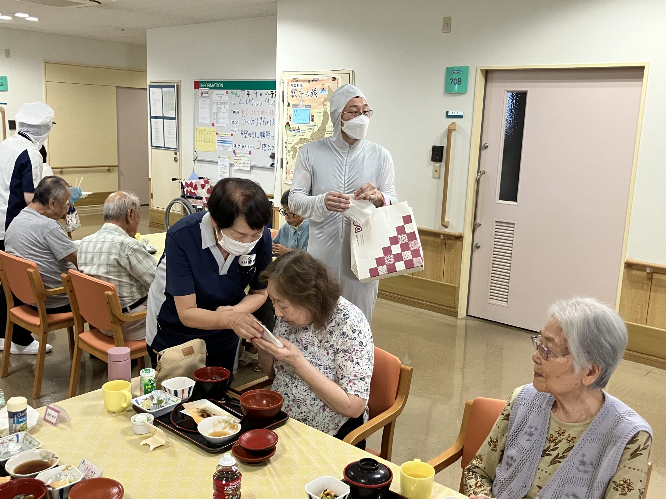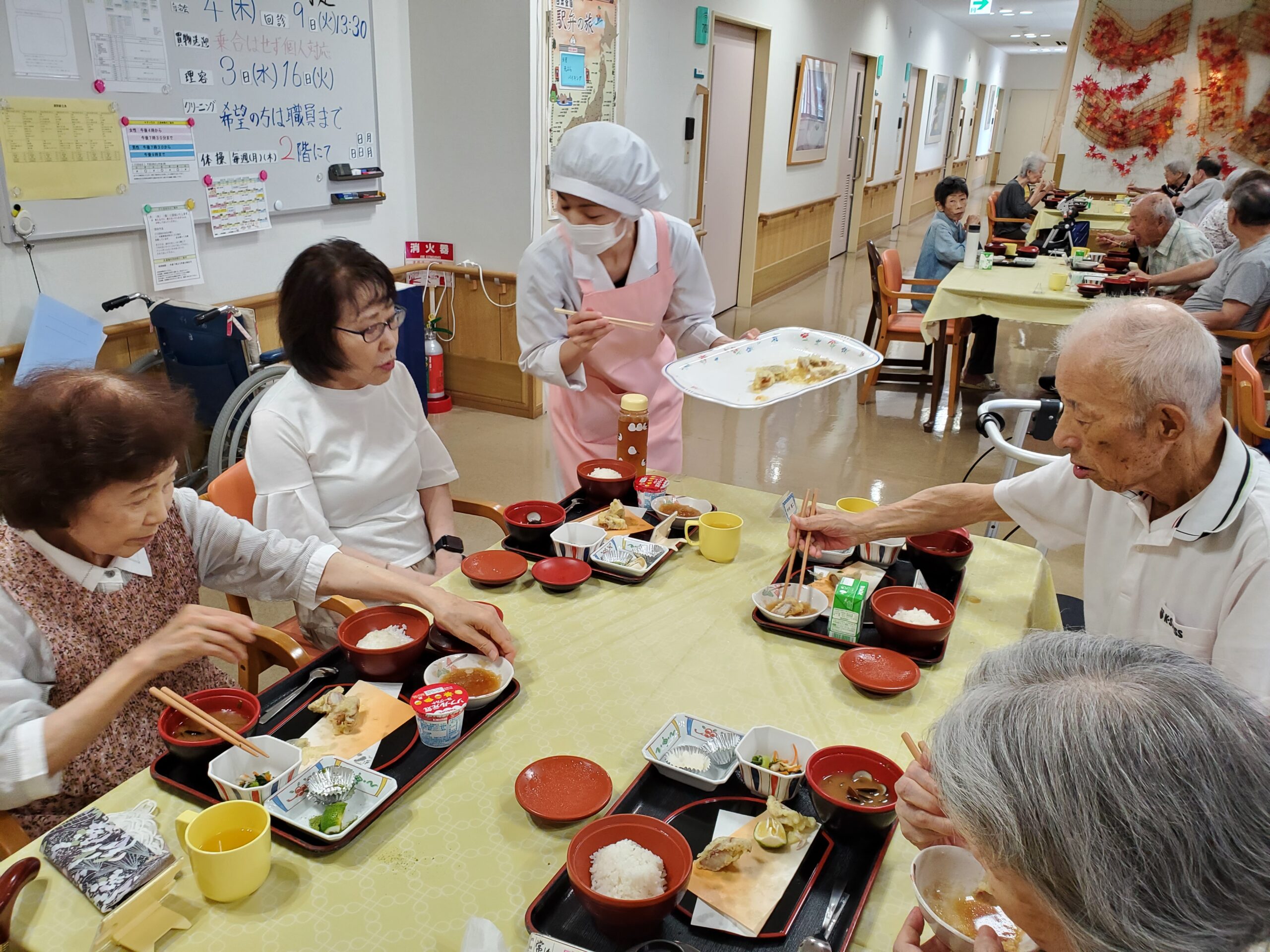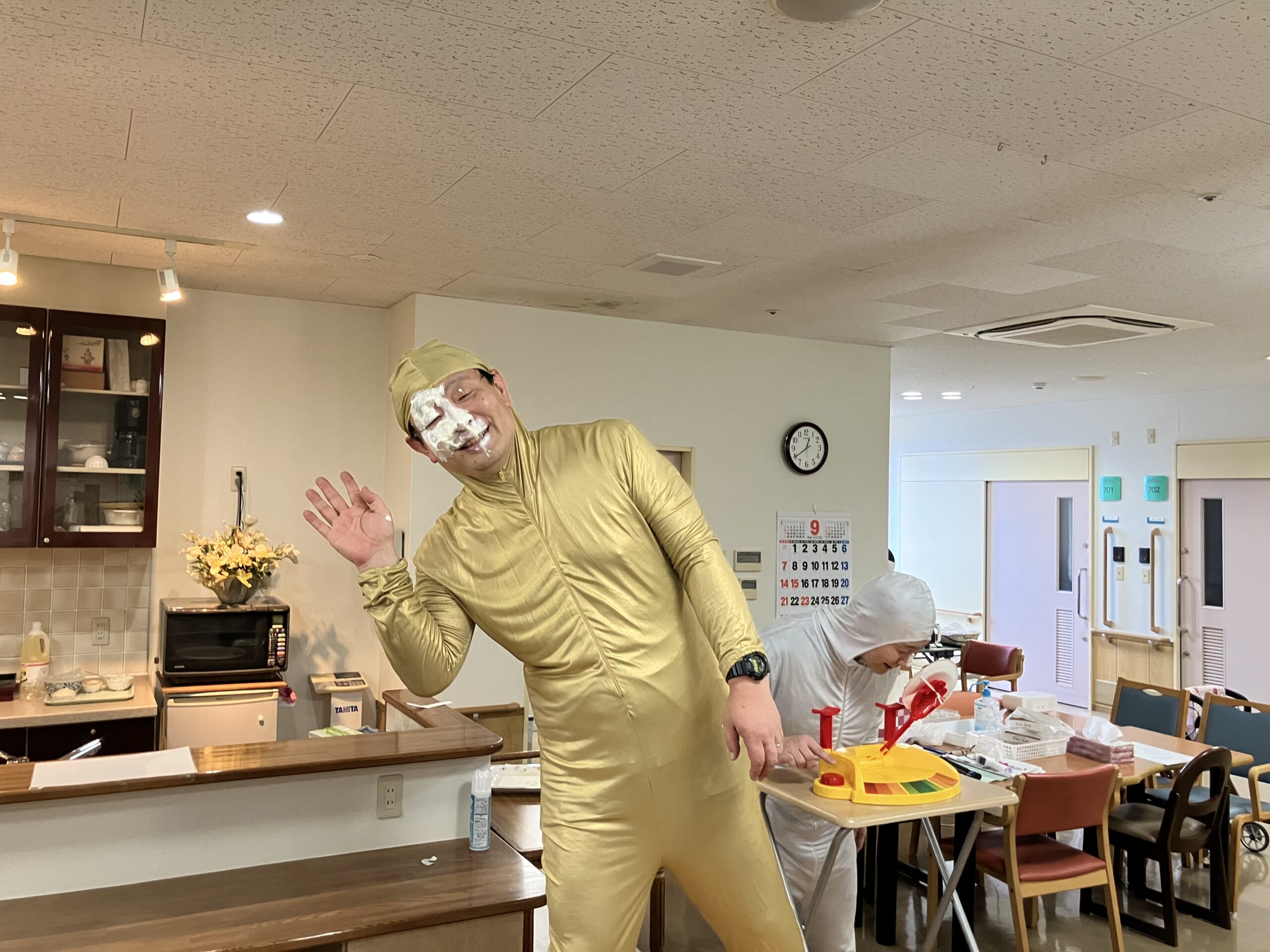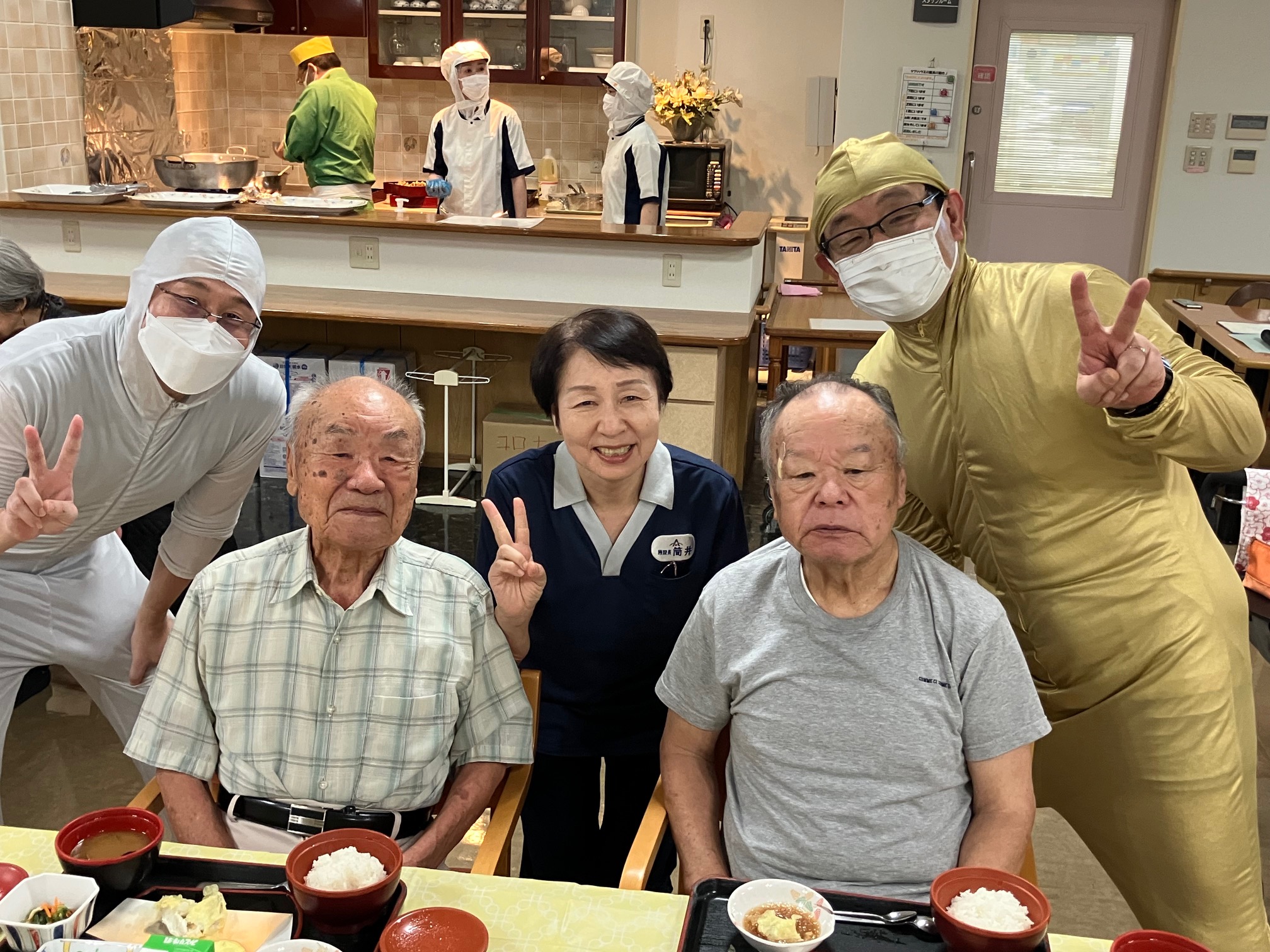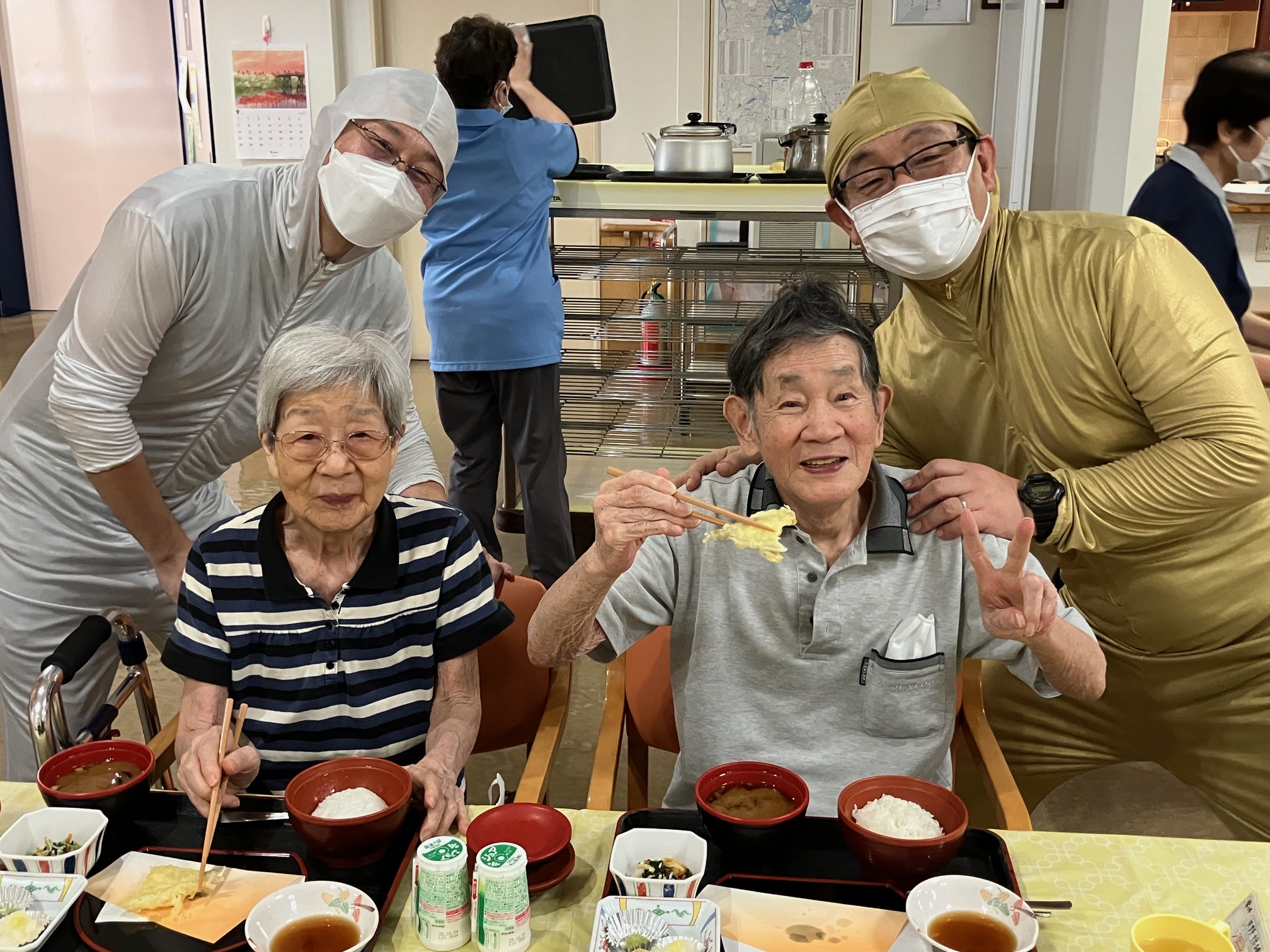 ケアハウスでは、9月18日に敬老会を催しました。 最高齢の95歳になられる利用者様を初め、 皆様に施設長よりお祝いの言葉を頂き 天ぷらバイキングでは『やっぱりあげたてがいいね』との 声が聞かれるなか、天ぷらを堪能して頂き、 職員の『金&銀』による 早押し!顔面!パイゲームで大爆笑⁉ おいしいの声と笑顔の敬老会でした。