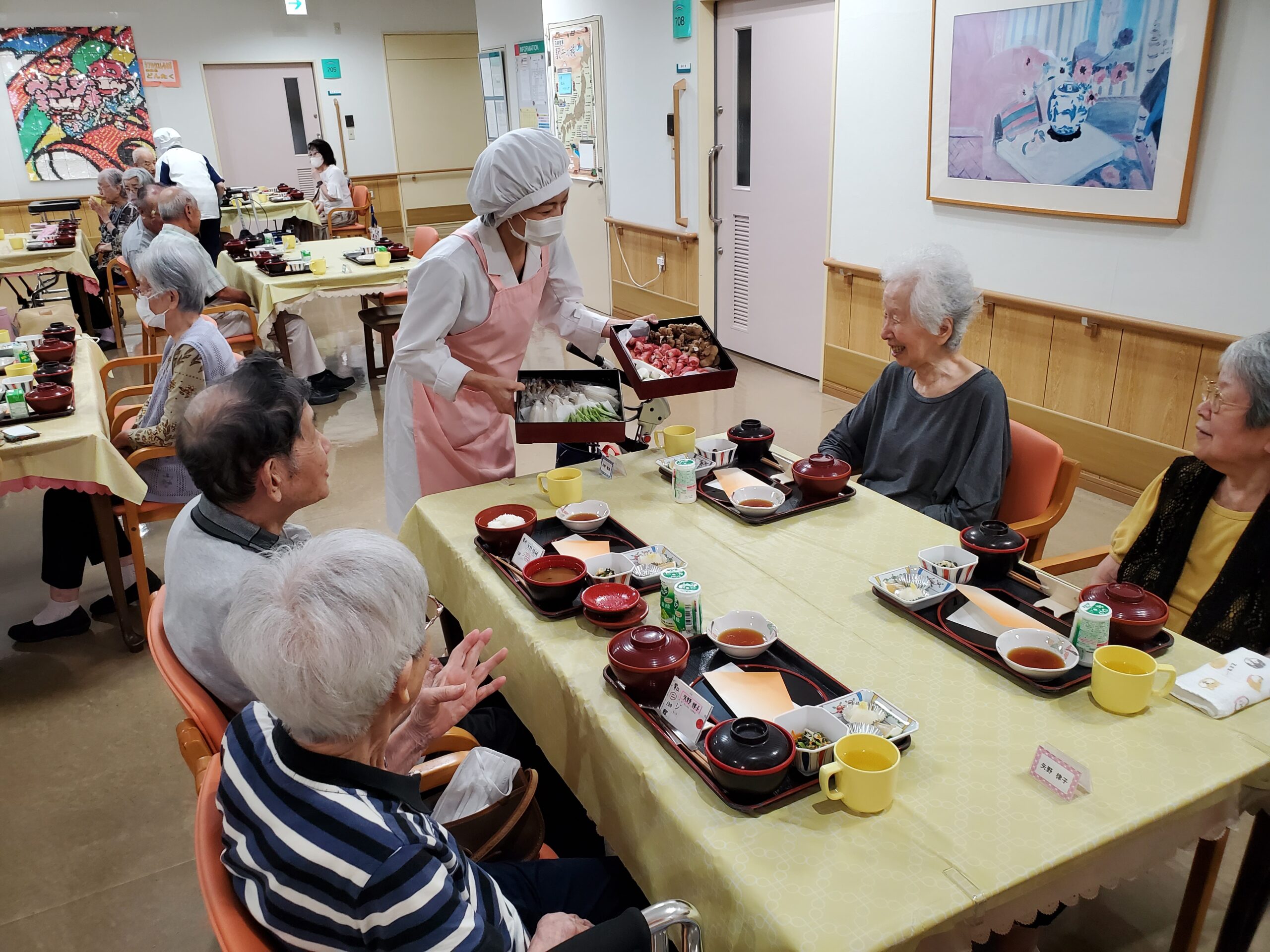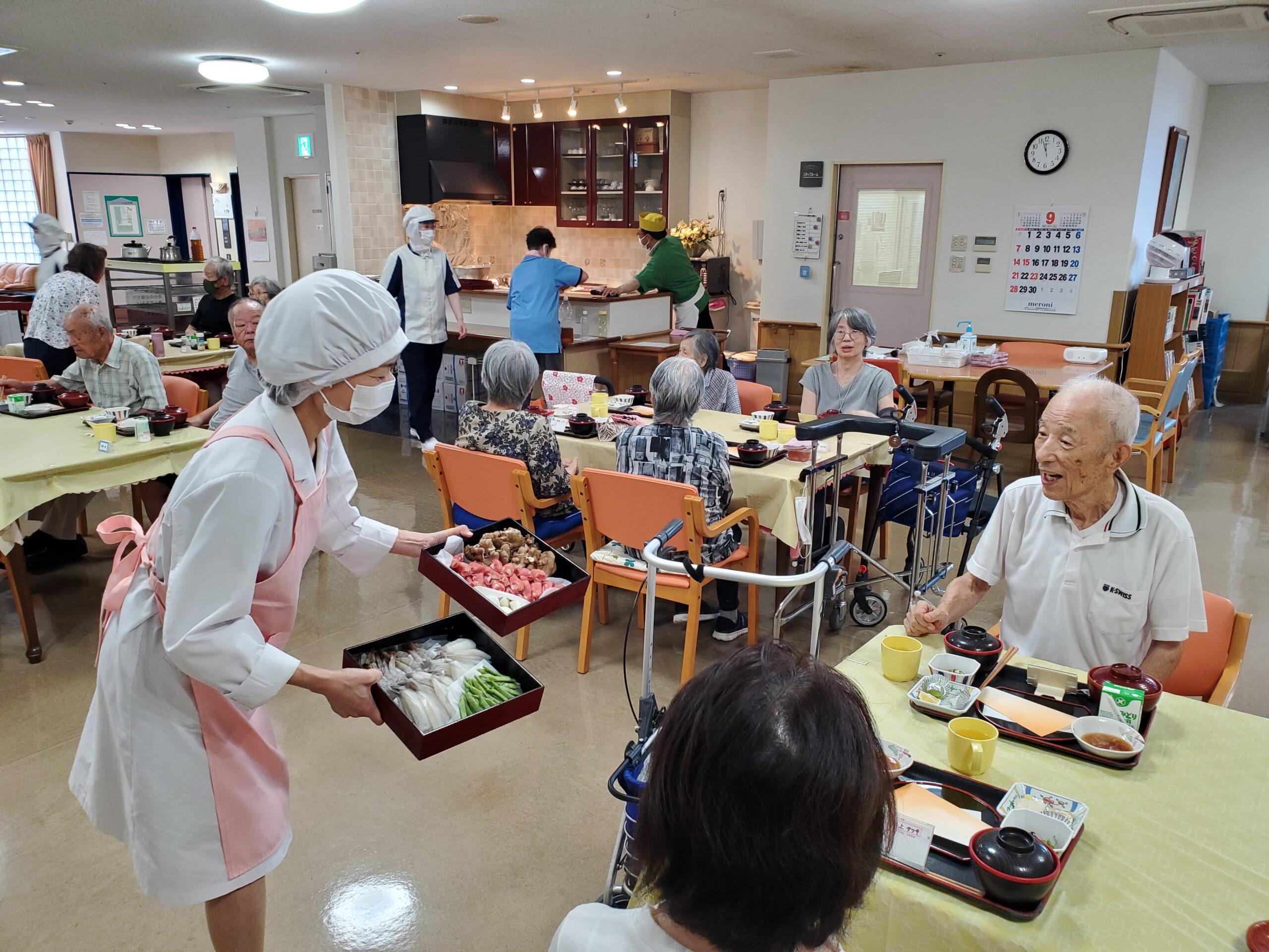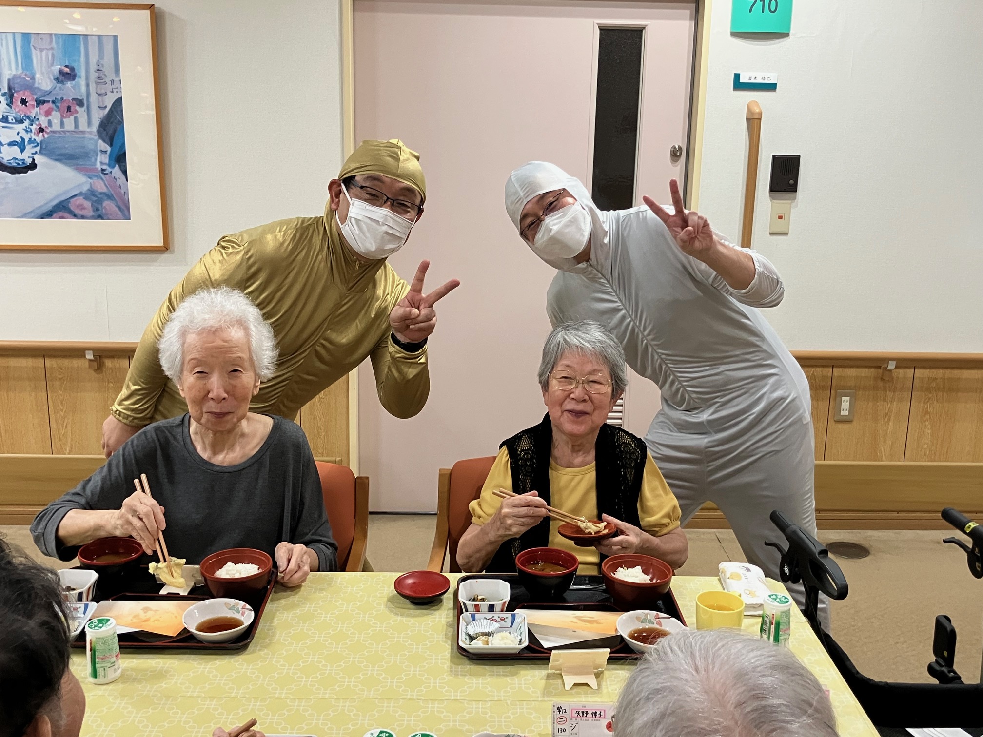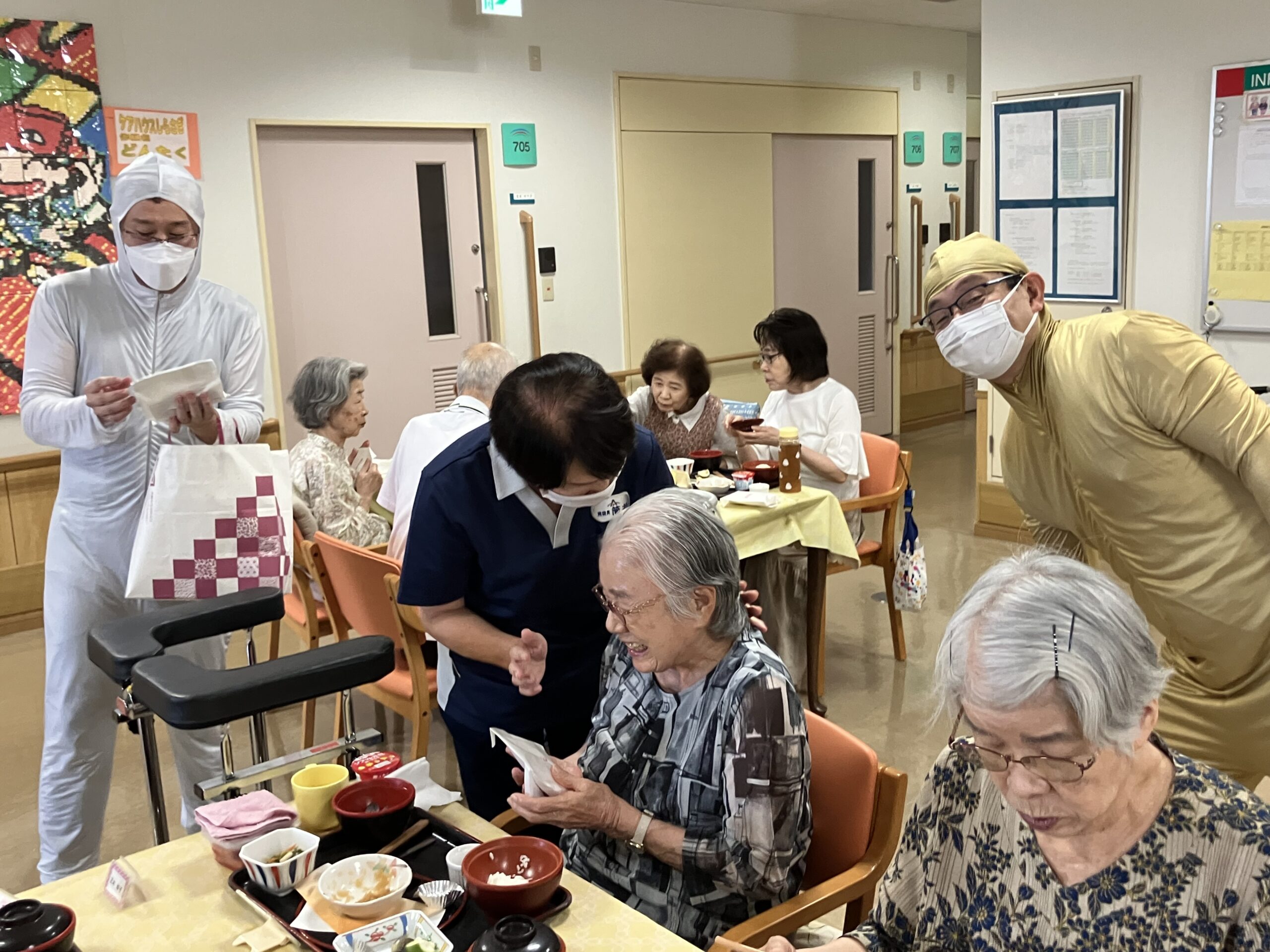 ケアハウスでは、9月18日に敬老会を催しました。 最高齢の95歳になられる利用者様を初め、 皆様に施設長よりお祝いの言葉を頂き 天ぷらバイキングでは『やっぱりあげたてがいいね』との 声が聞かれるなか、天ぷらを堪能して頂き、 職員の『金&銀』による 早押し!顔面!パイゲームで大爆笑⁉ おいしいの声と笑顔の敬老会でした。