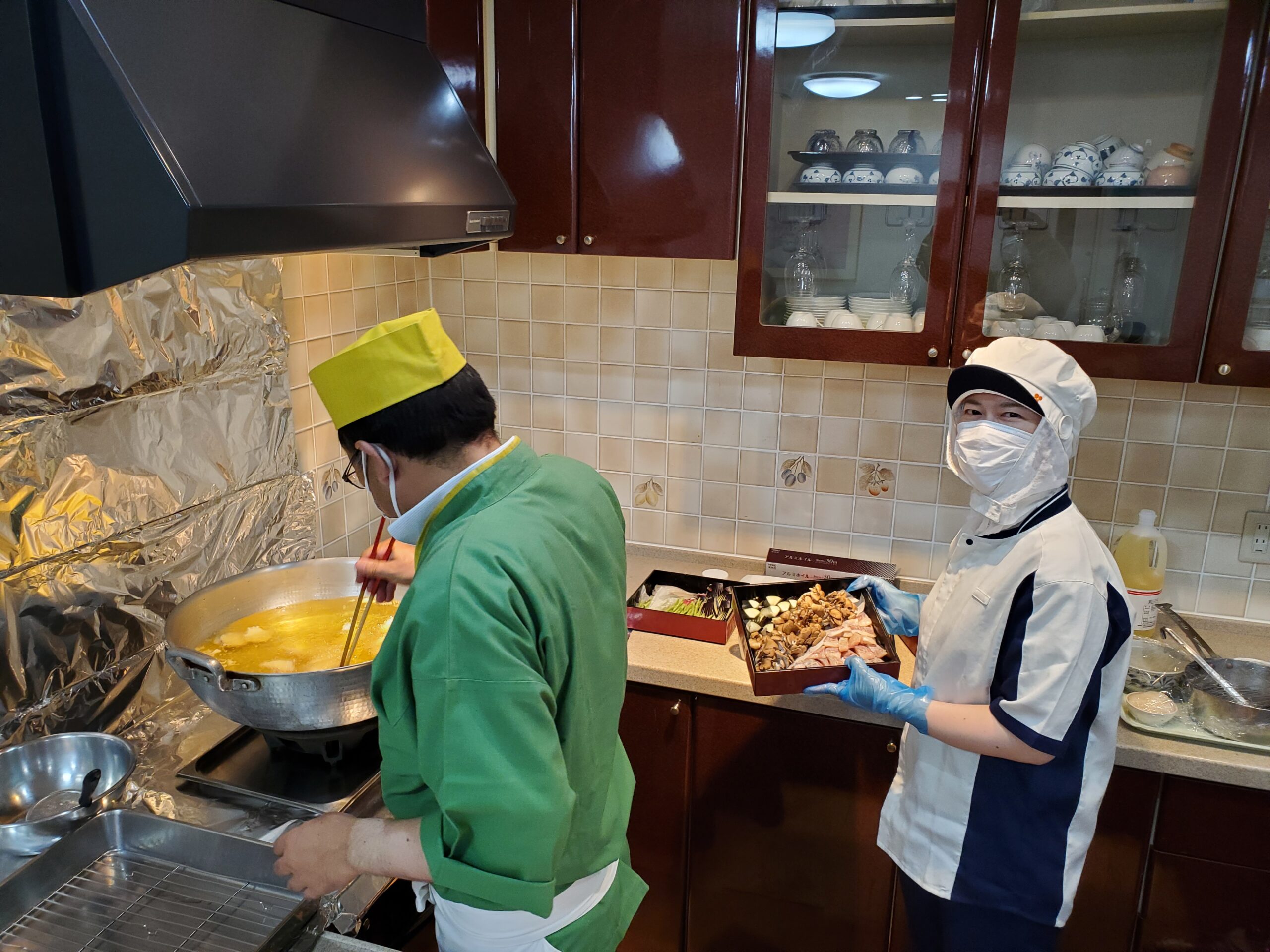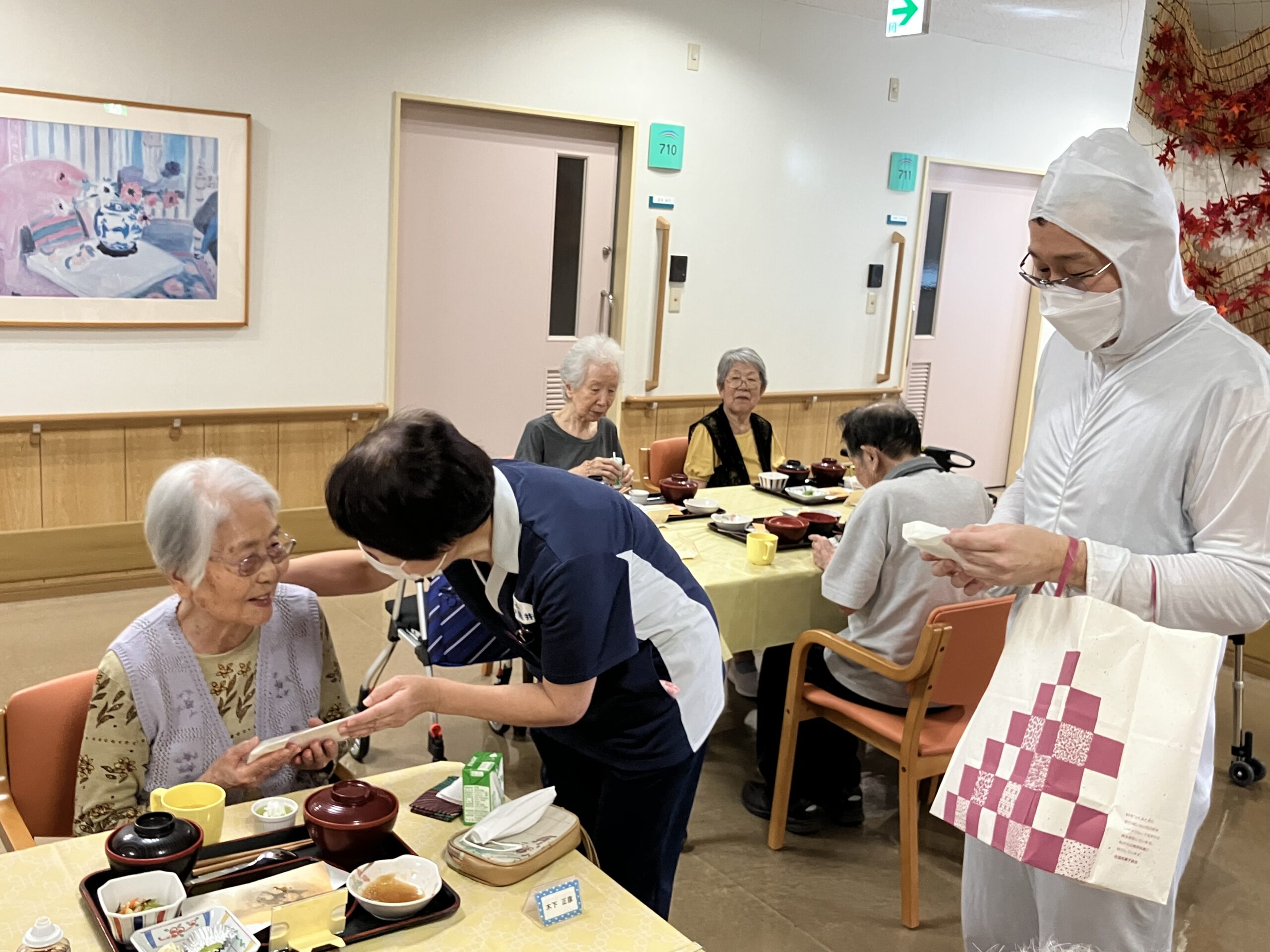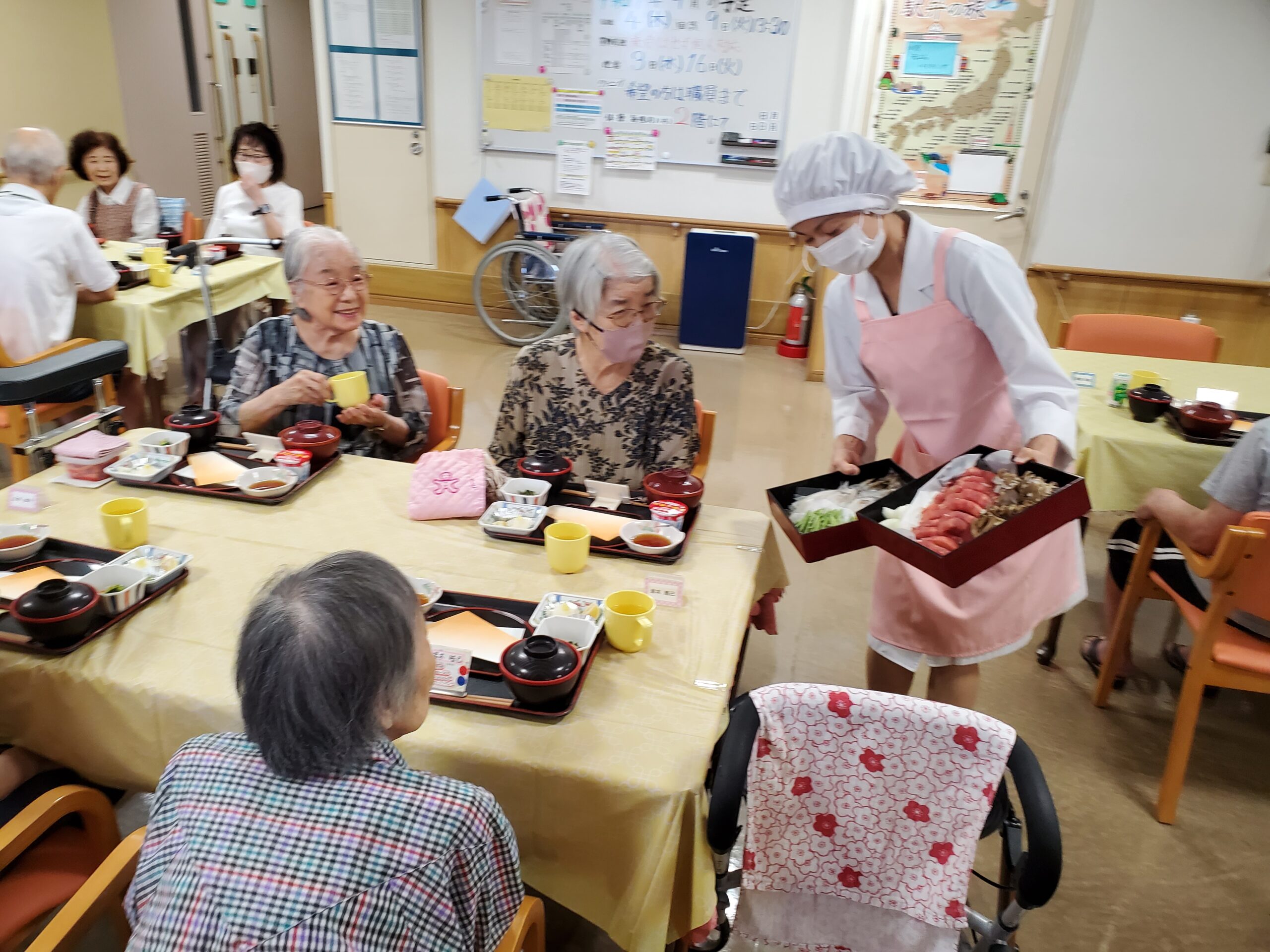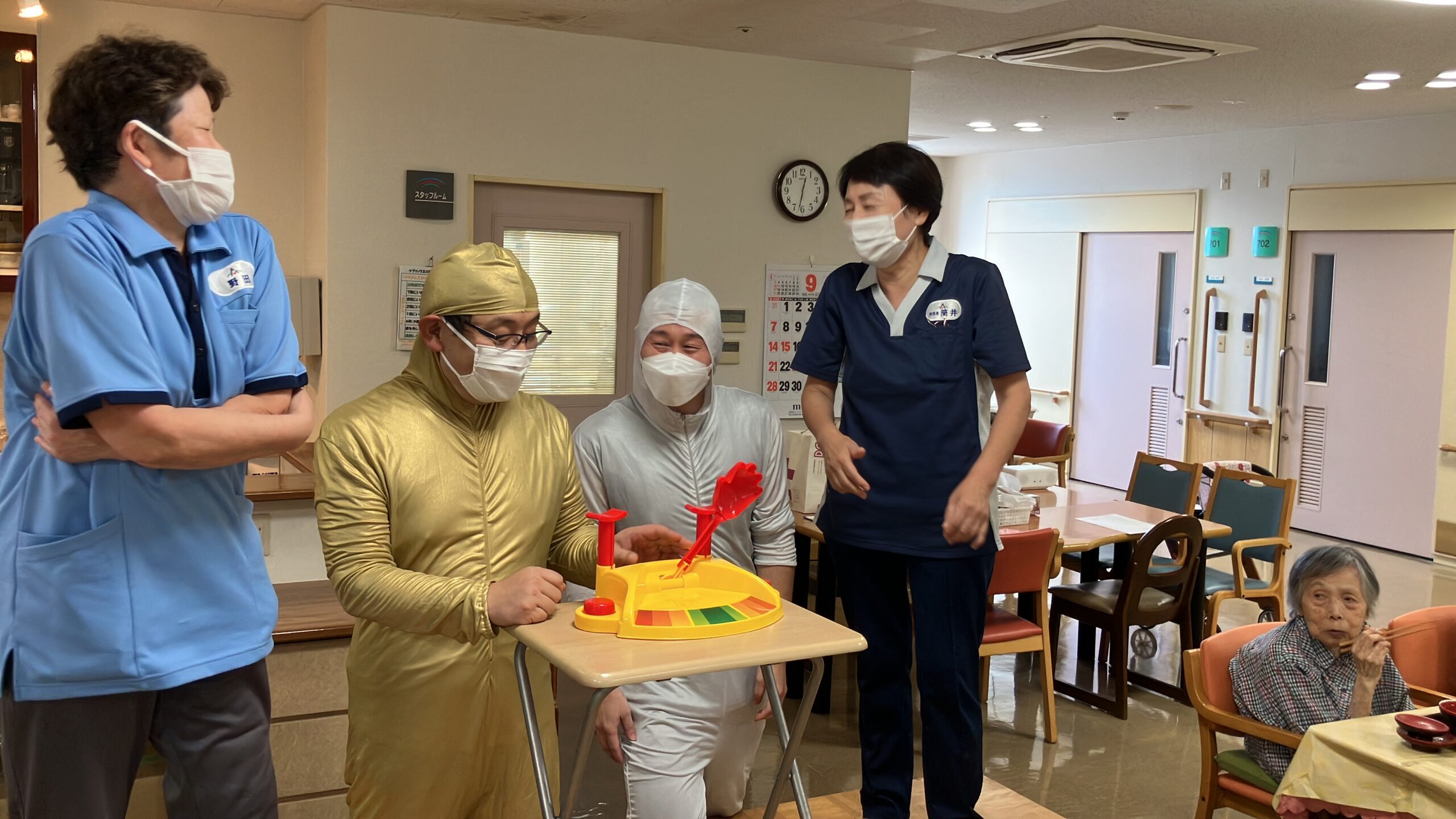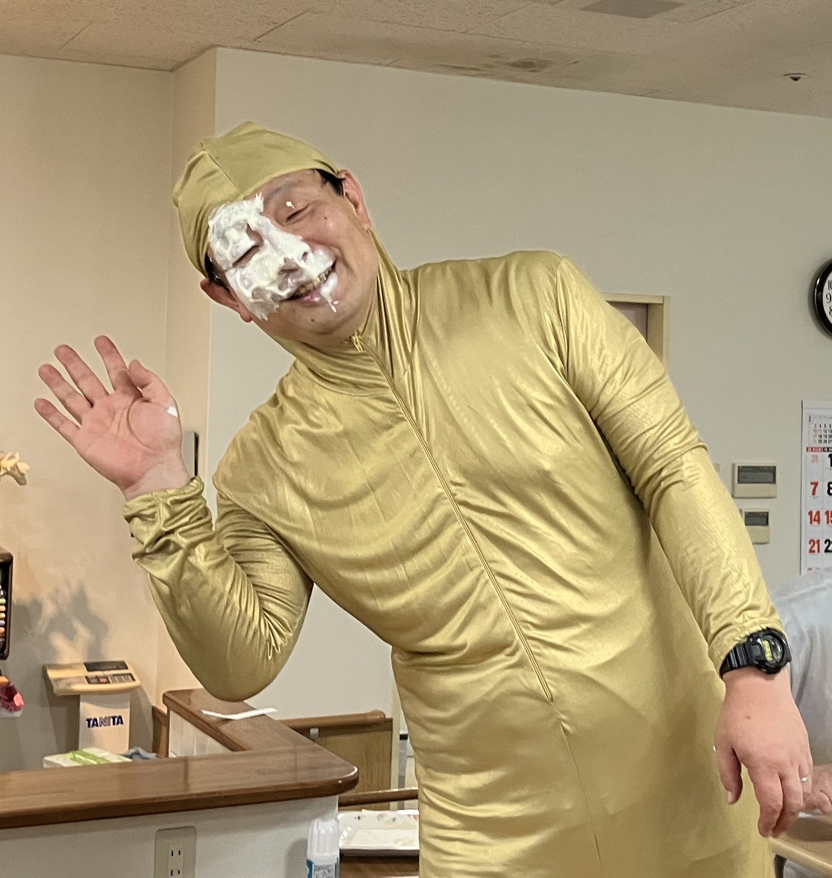 ケアハウスでは、9月18日に敬老会を催しました。 最高齢の95歳になられる利用者様を初め、 皆様に施設長よりお祝いの言葉を頂き 天ぷらバイキングでは『やっぱりあげたてがいいね』との 声が聞かれるなか、天ぷらを堪能して頂き、 職員の『金&銀』による 早押し!顔面!パイゲームで大爆笑⁉ おいしいの声と笑顔の敬老会でした。
