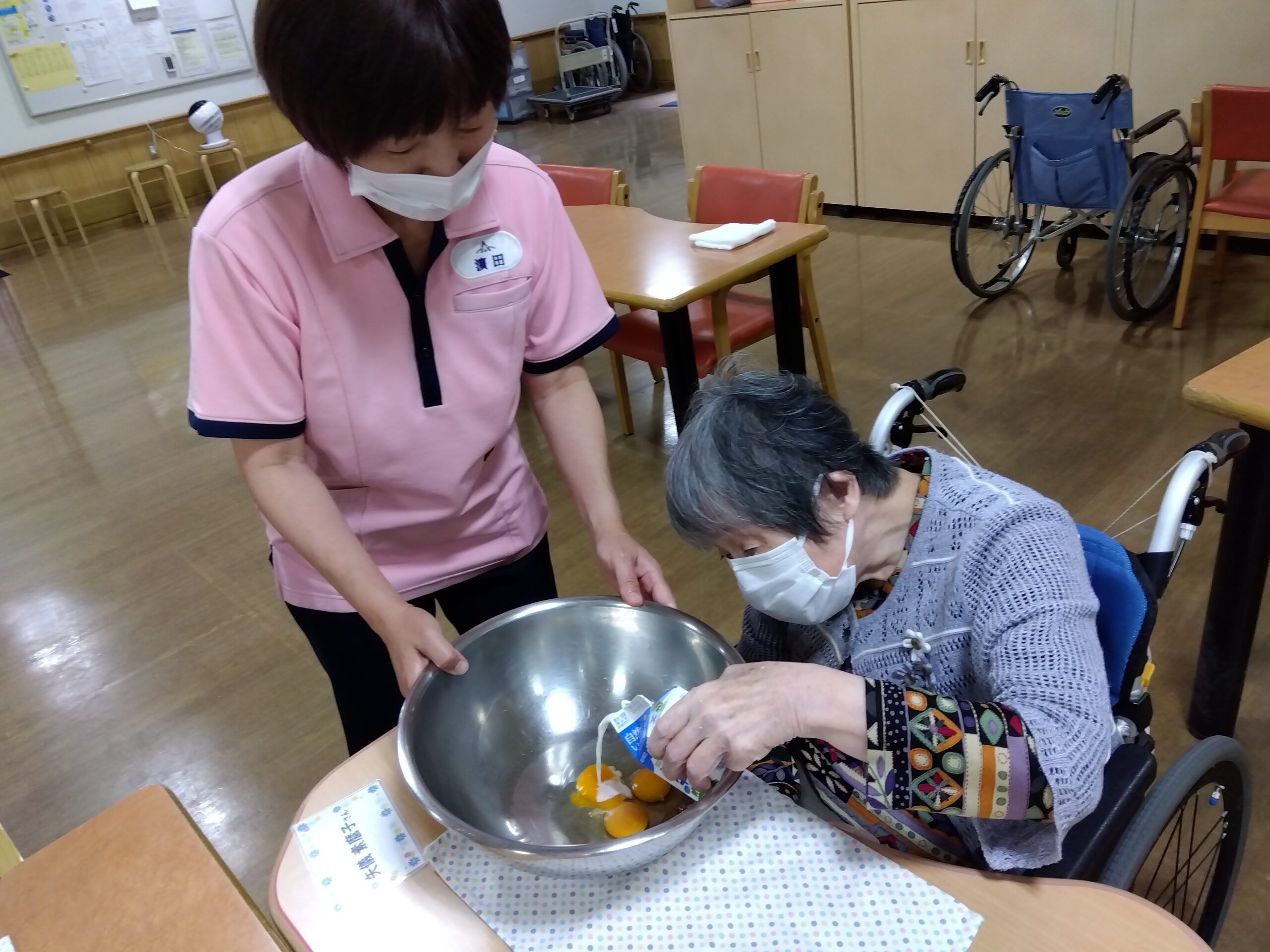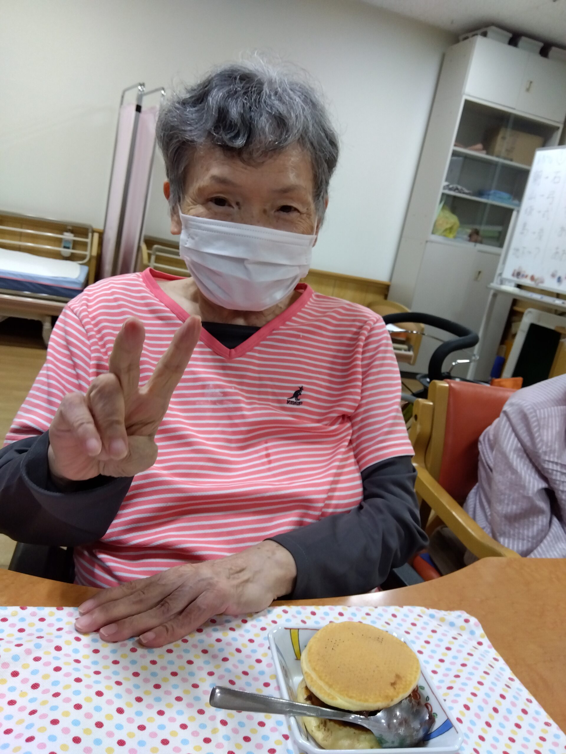みんなでどら焼き作りをしました。 今回は、最初から最後まで利用者のみなさんで頑張りました。 慣れた手つきで混ぜ合わせ、力が入らないと立ち上がられ 楽しそうに作業されていました。 秋の味覚の話題で盛り上がり、美味しそうに召し上がられてました。