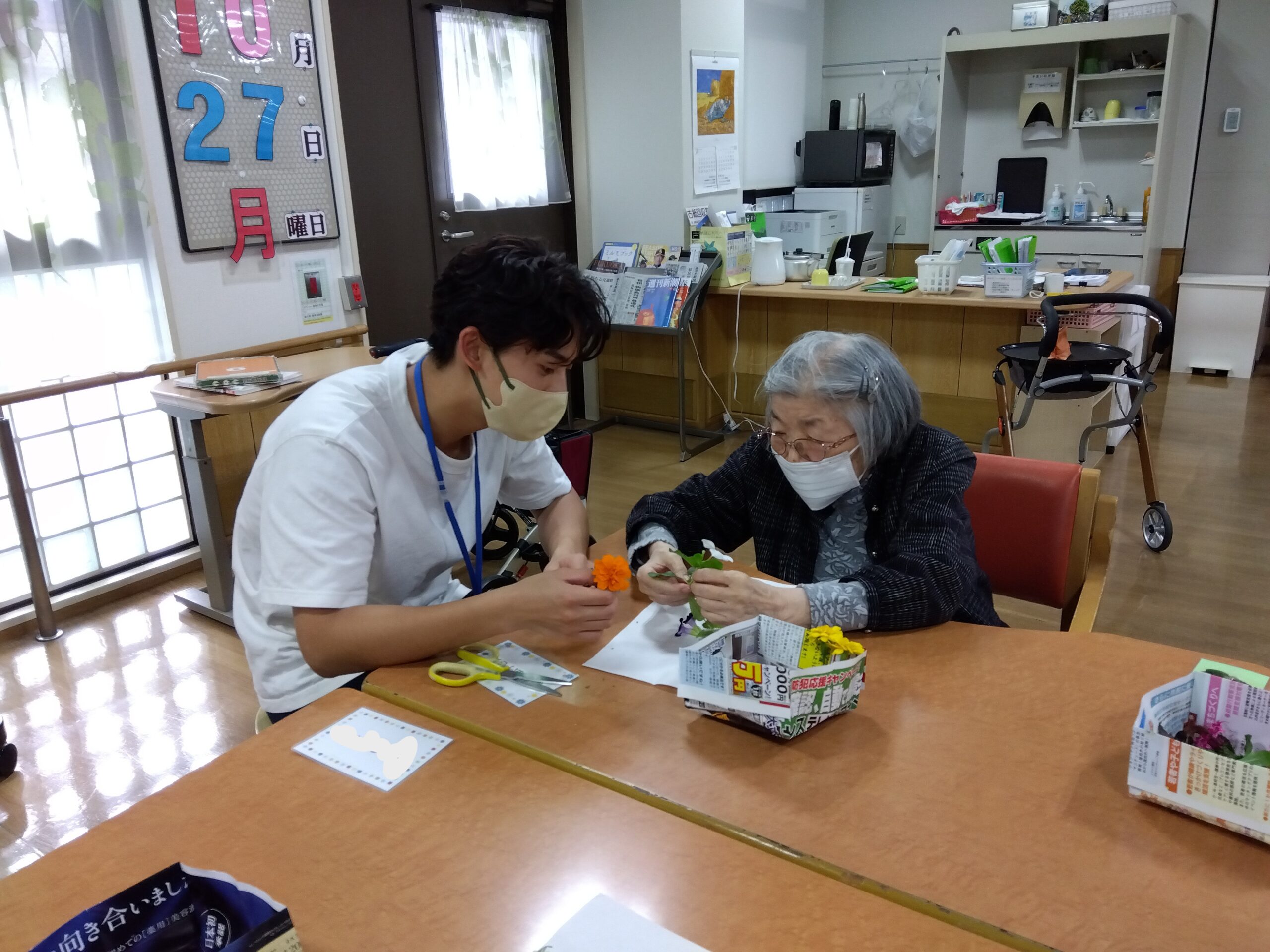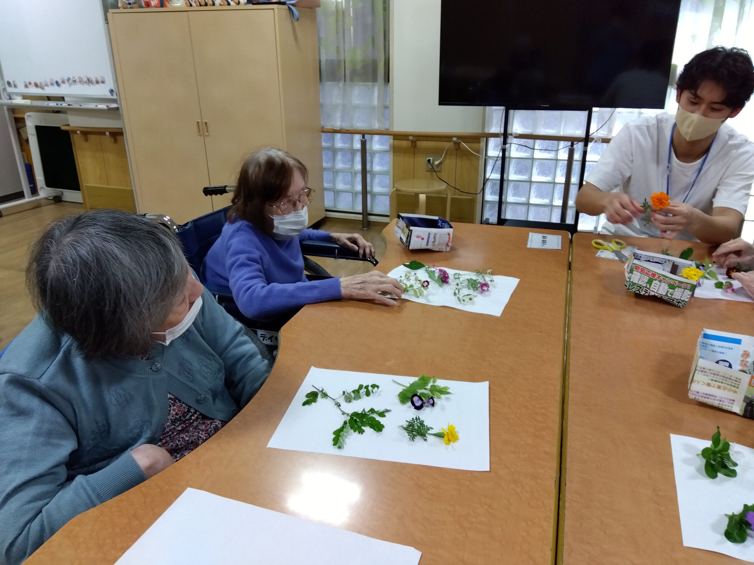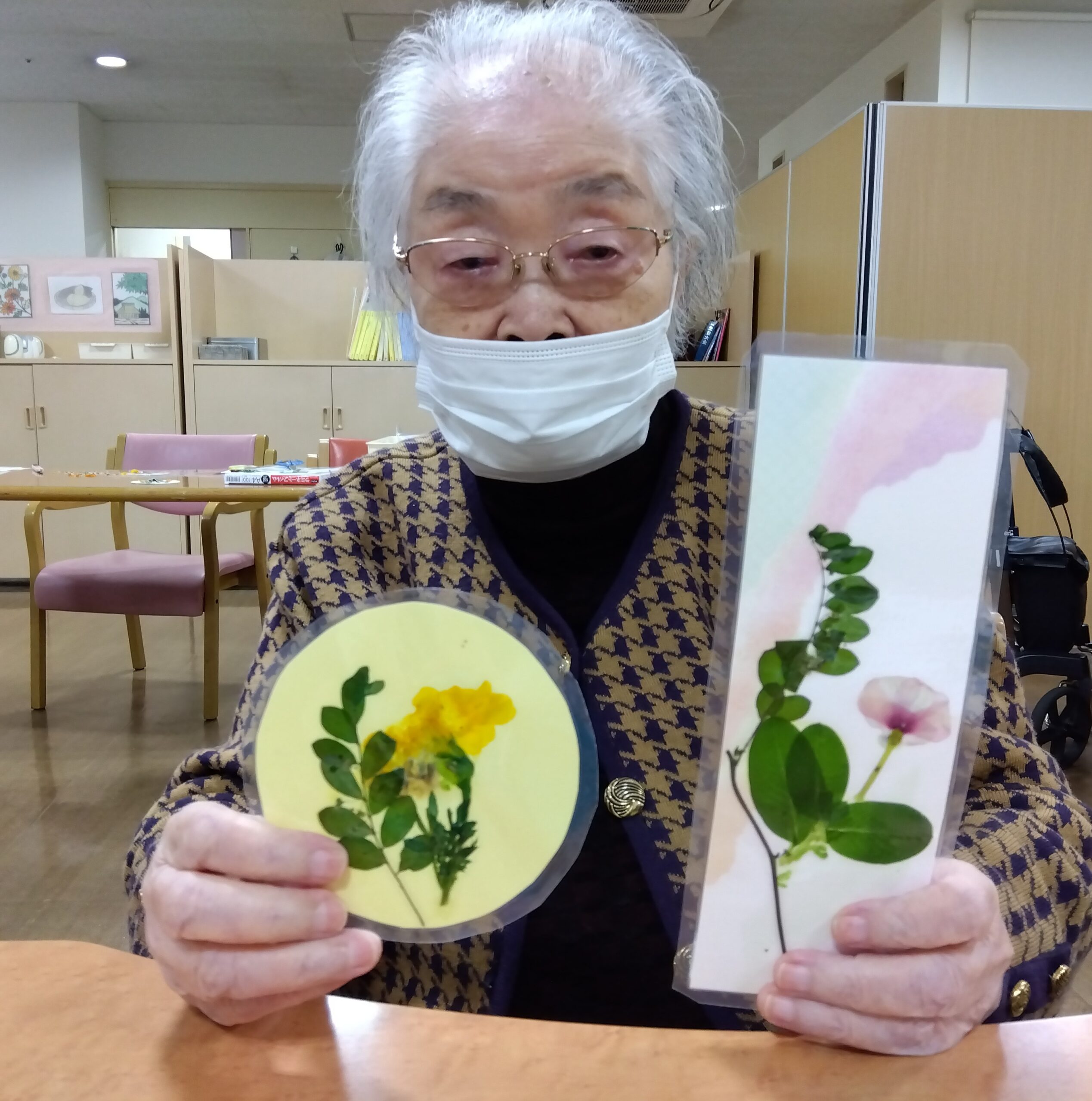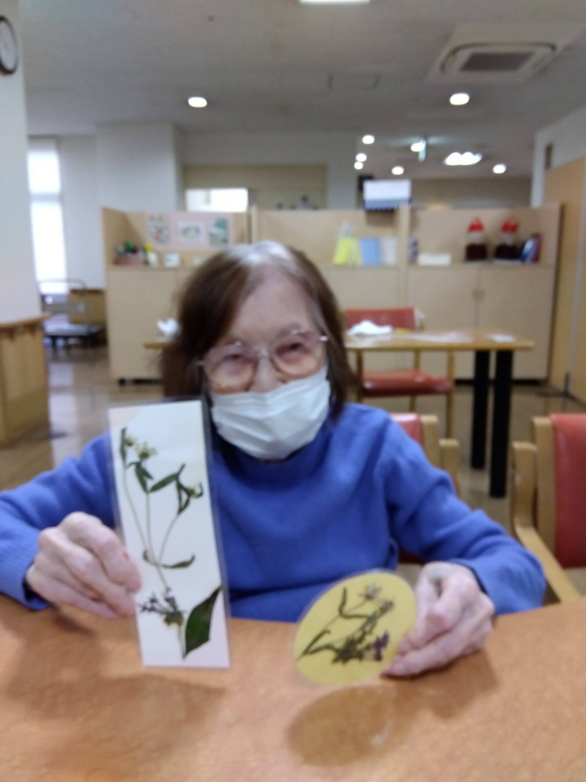 施設の駐車場に咲いていたお花を使って 押し花作りをしました。 摘んだ花は、重石を乗せて数日間おきます。 乾燥した花を台紙に並べて、ラミネートをして仕上げました。 福大の学生さんが実習に来られていたので、 一緒におしゃべりをしながら楽しみました♪