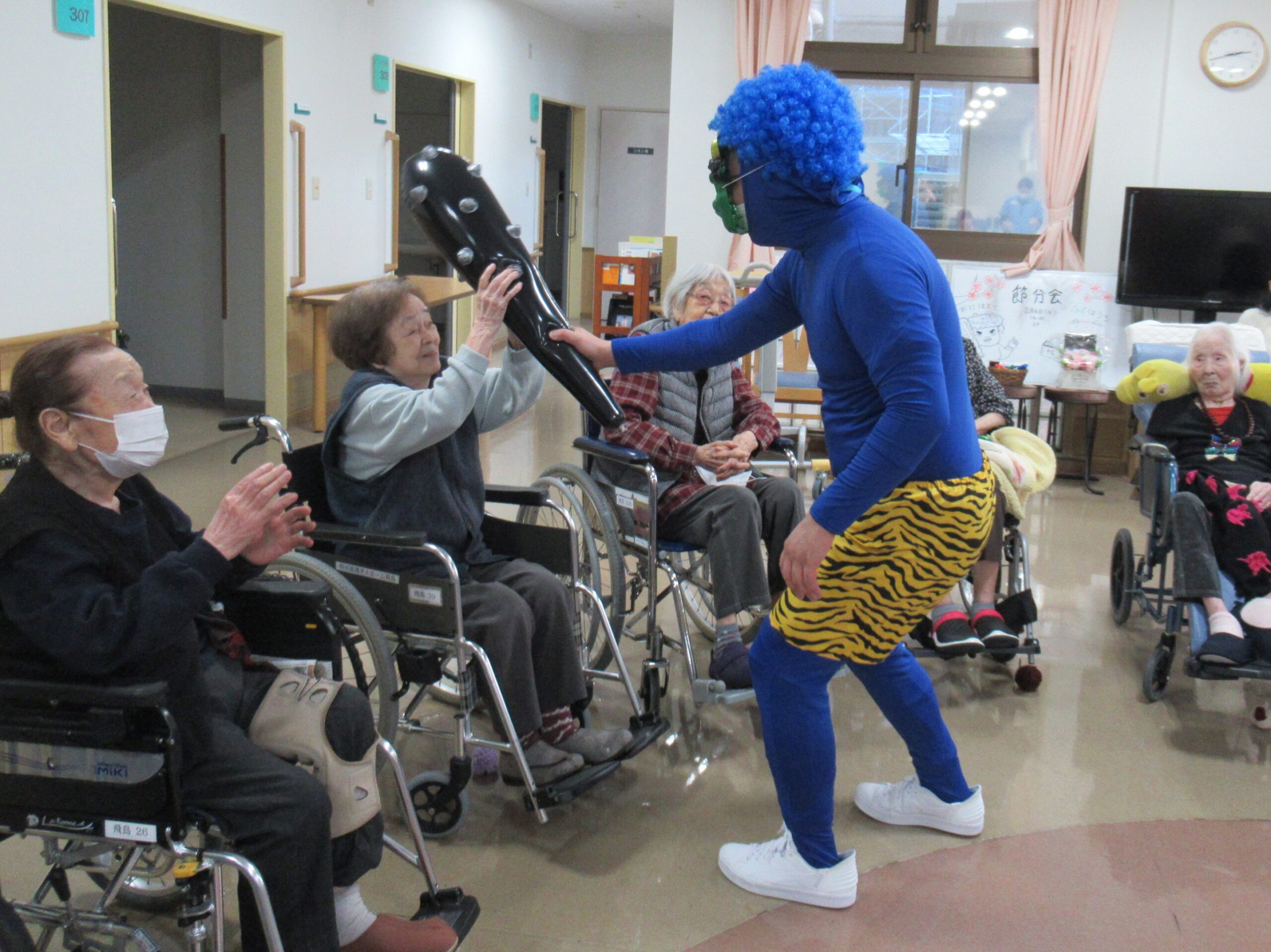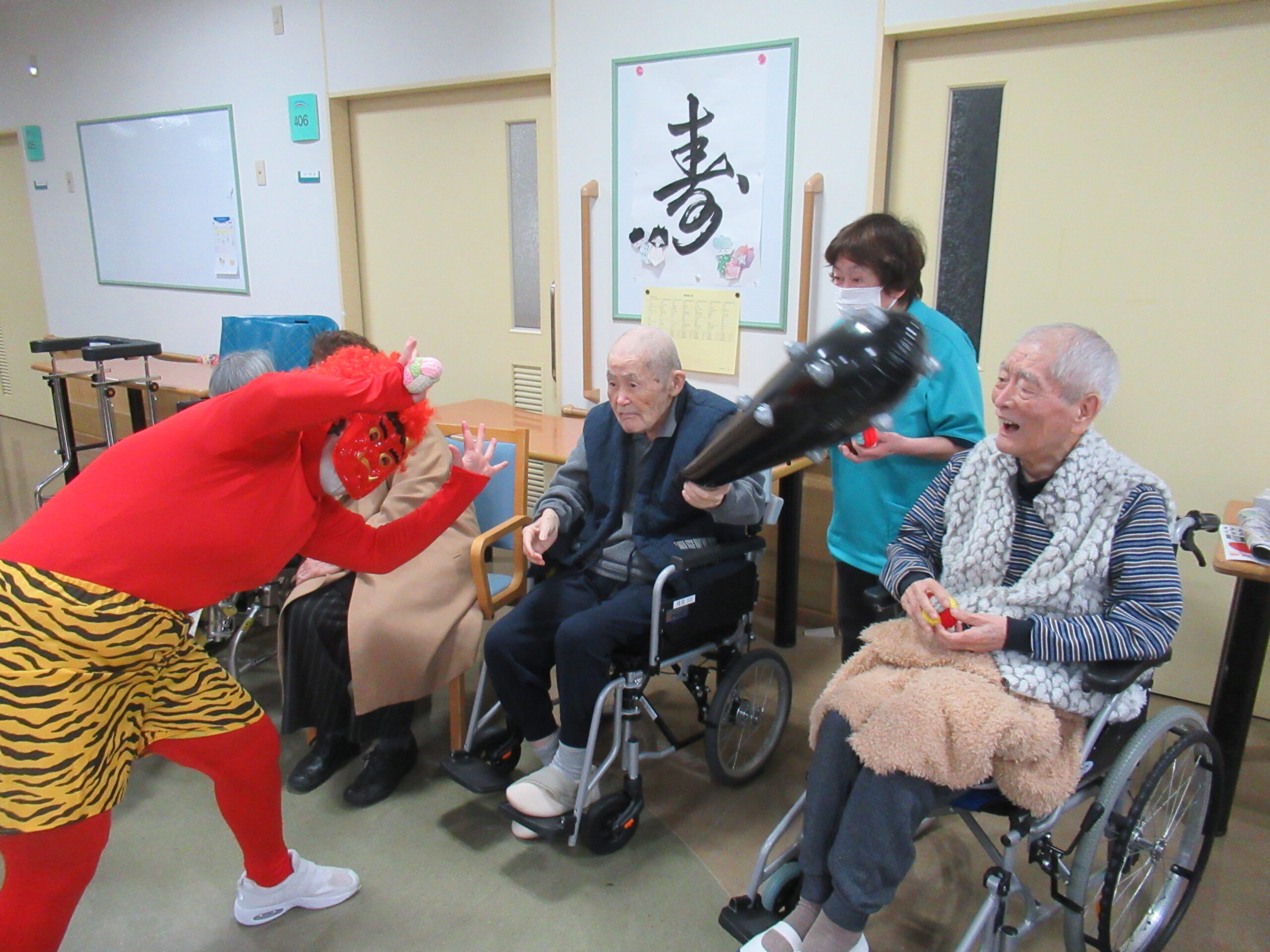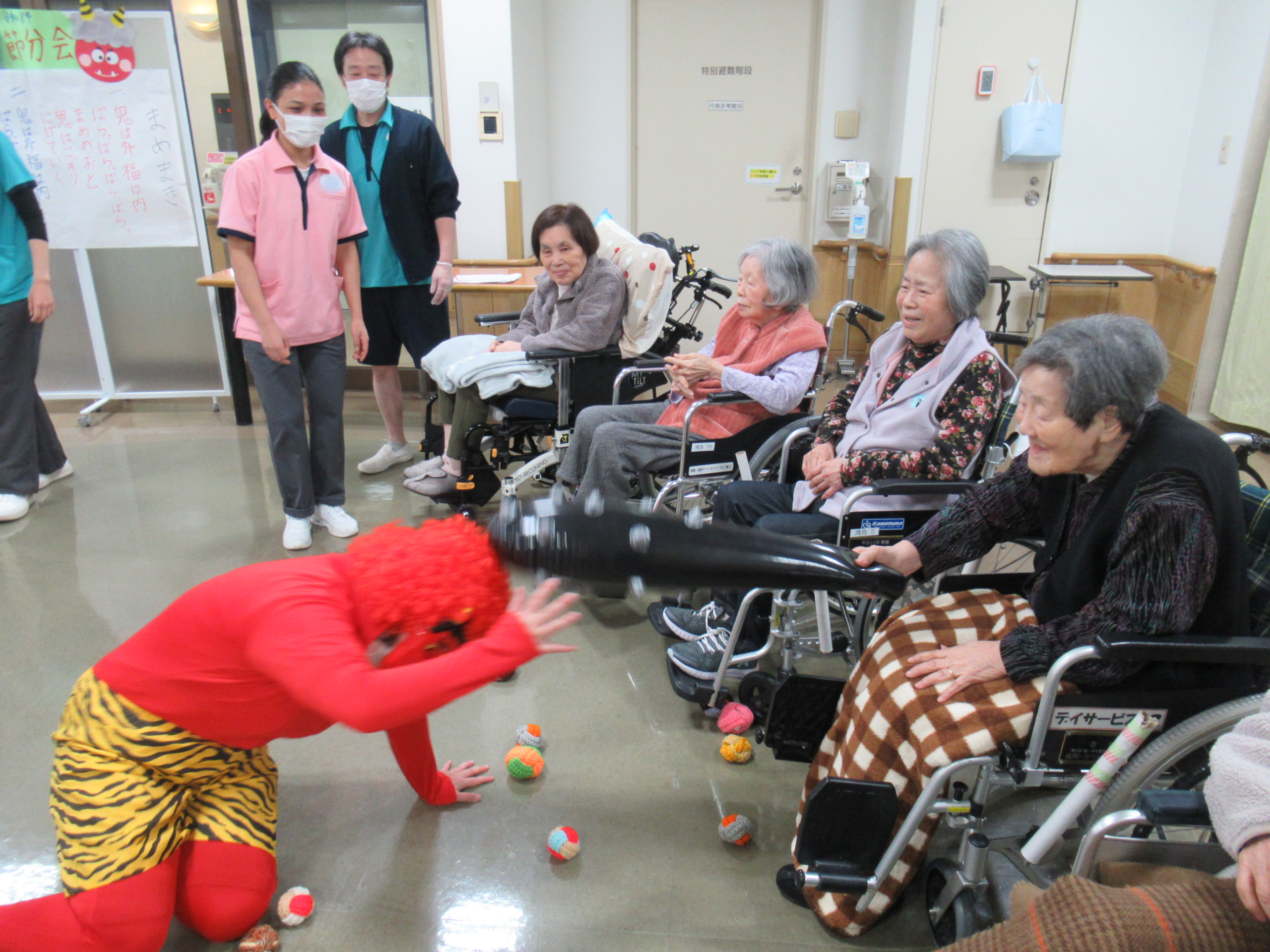 2月4日節分会を開催しました。 準備運動をして毛糸玉を投げる鬼退治の練習をして準備万端! 飛鳥に赤鬼・青鬼がやってきました!! 「鬼は外!福は内!」と練習の成果を発揮し、鬼に毛糸玉やビーチボールを投げ、また鬼の金棒を取り上げて鬼退治を楽しんで頂きました。 最後は「また来るね~」と山?へ帰って行った赤鬼・青鬼に手を振る方や労いの拍手でお見送り。 皆さんの様々な表情を見る事が出来た、楽しい節分会となりました。