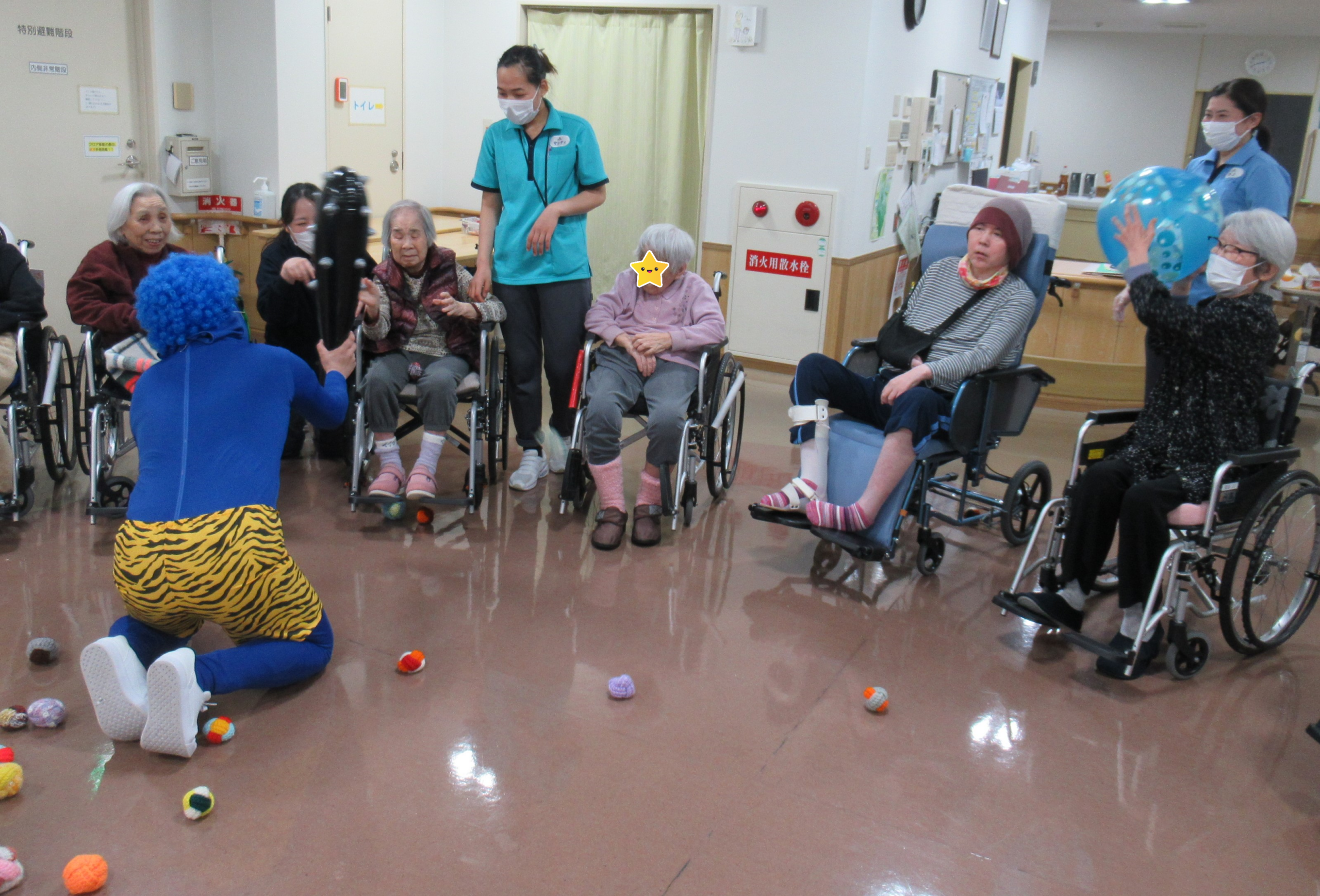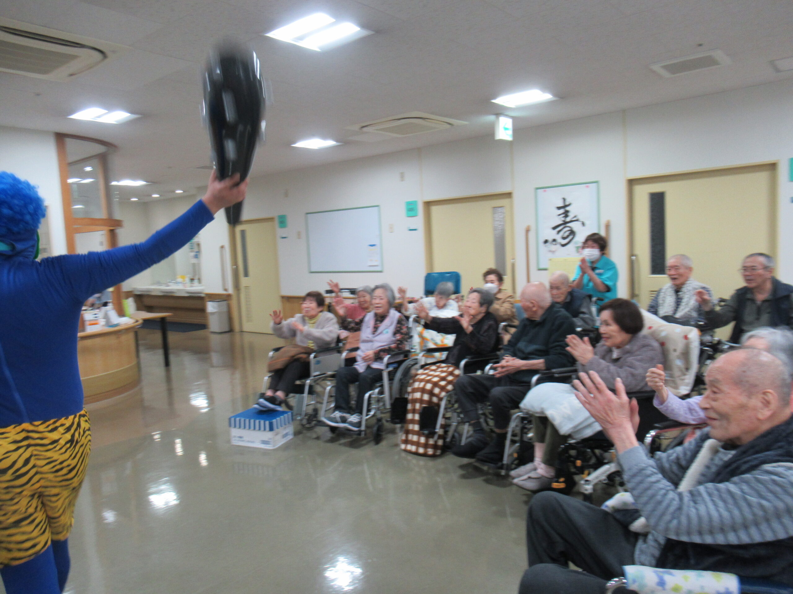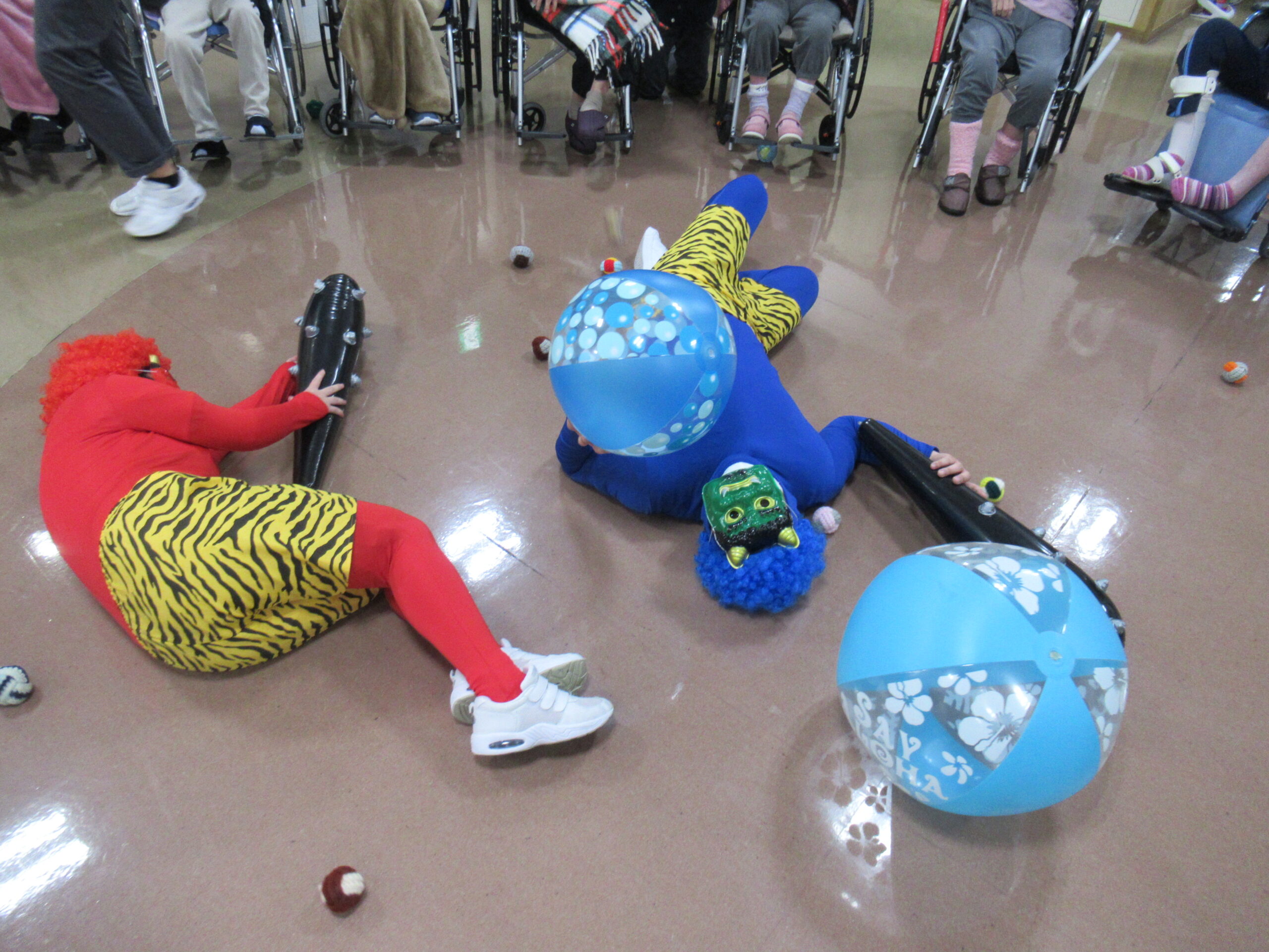 2月4日節分会を開催しました。 準備運動をして毛糸玉を投げる鬼退治の練習をして準備万端! 飛鳥に赤鬼・青鬼がやってきました!! 「鬼は外!福は内!」と練習の成果を発揮し、鬼に毛糸玉やビーチボールを投げ、また鬼の金棒を取り上げて鬼退治を楽しんで頂きました。 最後は「また来るね~」と山?へ帰って行った赤鬼・青鬼に手を振る方や労いの拍手でお見送り。 皆さんの様々な表情を見る事が出来た、楽しい節分会となりました。